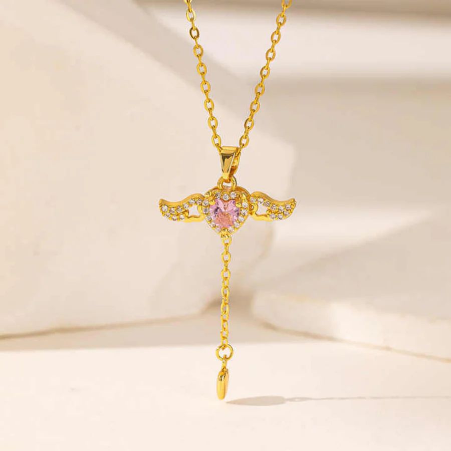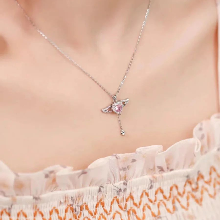Zarif tasarımı ve romantik detaylarıyla öne çıkan bu melek kanadı kalpli kolye, şıklığı ve anlamı bir arada sunar. Ortasında yer alan pembe kalp taş, sevgi ve zarafeti simgelerken, etrafını saran melek kanadı figürü koruma ve masumiyeti temsil eder.